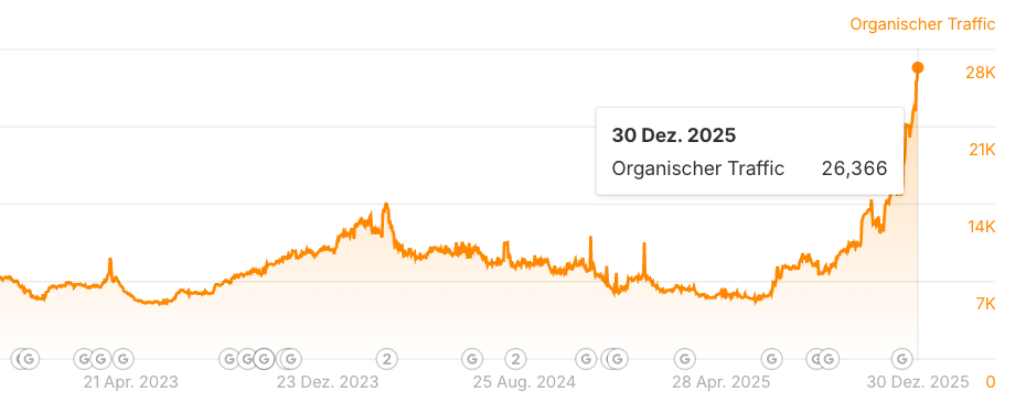 Der organische Google Traffic stieg im Laufe der Zusammenarbeit von rund 5.400 auf 26.366 Besucher pro Tag. Das entspricht einem Wachstum von rund 388,3 % und damit einer nahezu verfünffachten organischen Reichweite.